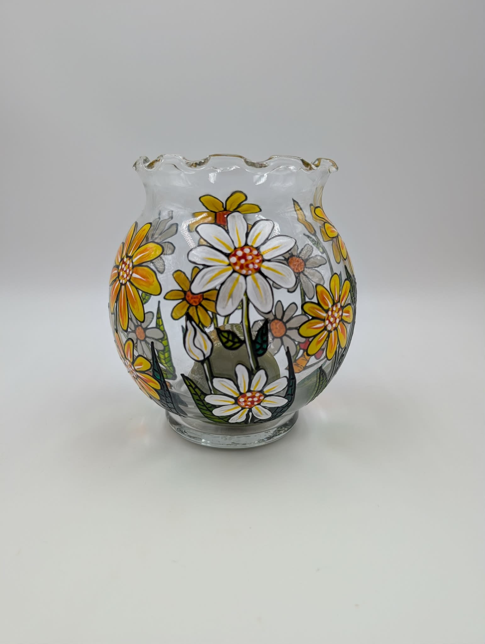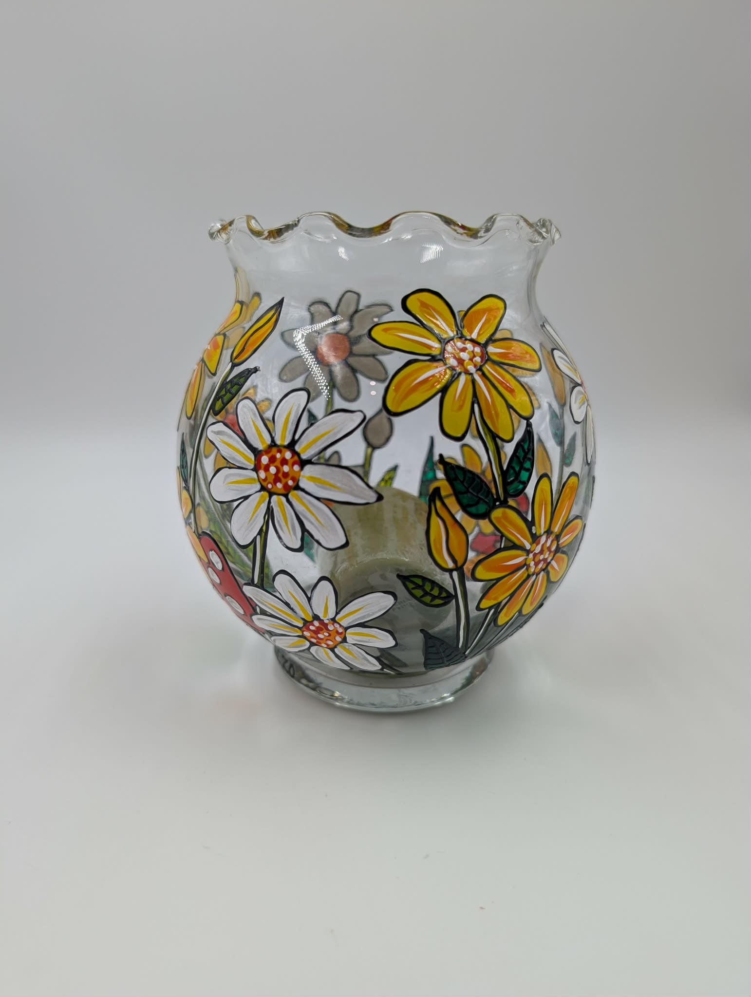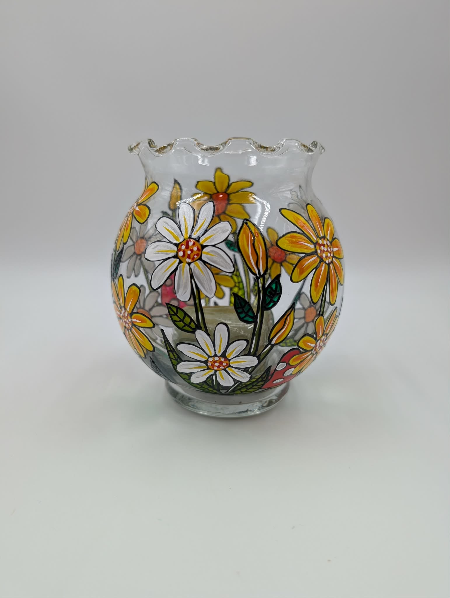 Chandelier frisé peint à la main aux dessins de jolies marguerites blanches et jaunes et de champignons.