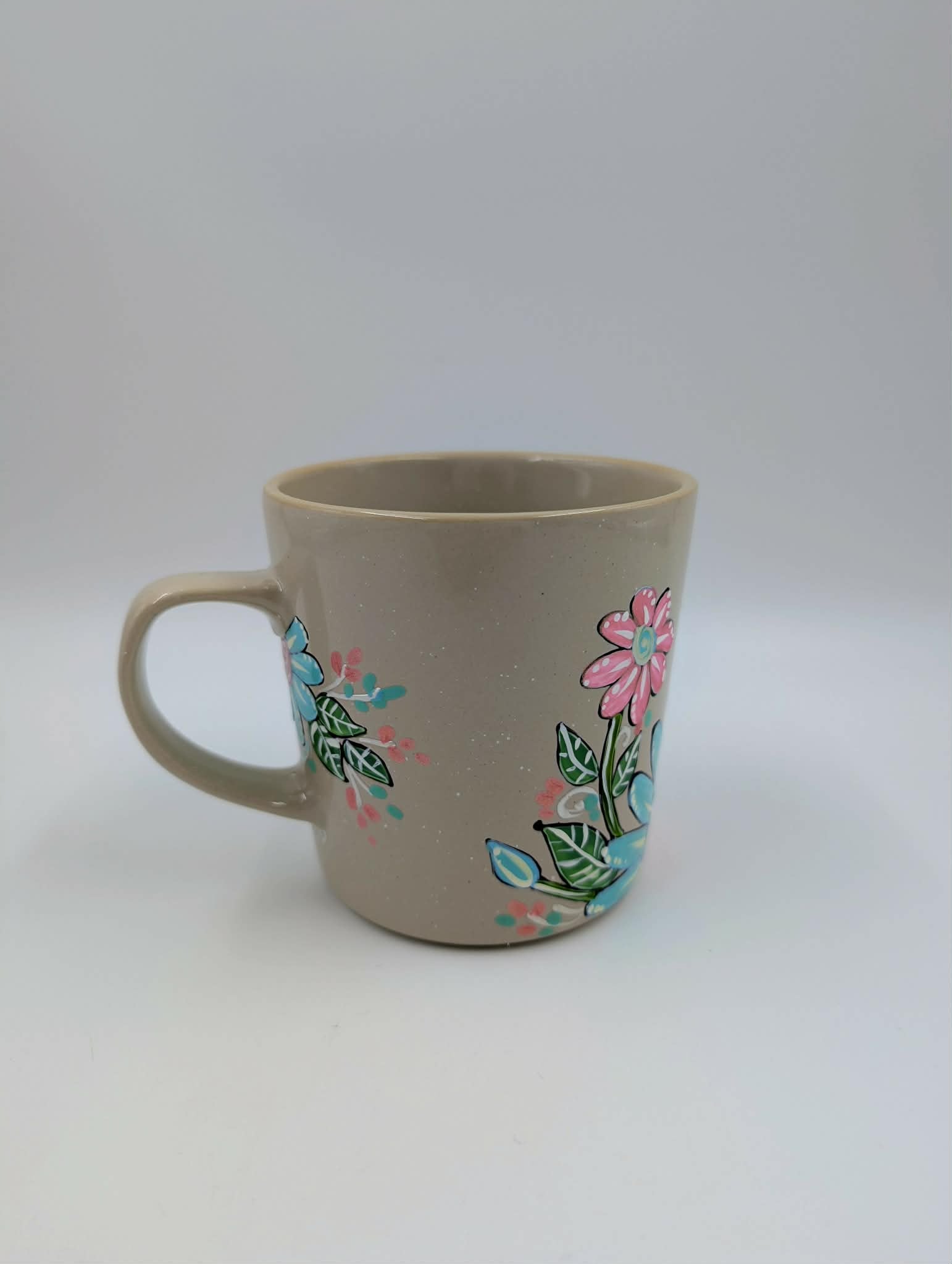Tasse de couleur bleu pâle avec des jolies marguerites roses et turquoises.