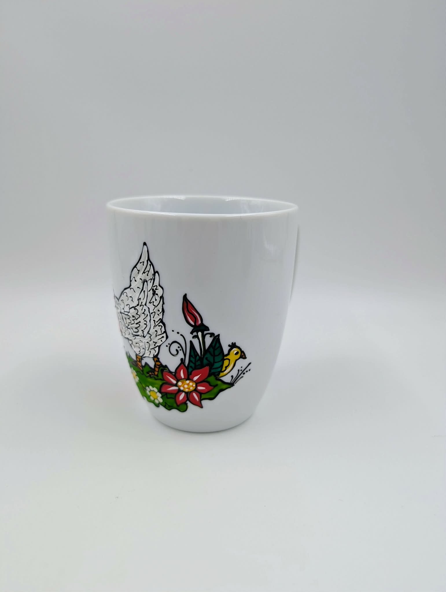 Tasse en porcelaine blanche peinte à la main avec dessins d'une jolie poule et ses deux poussins
