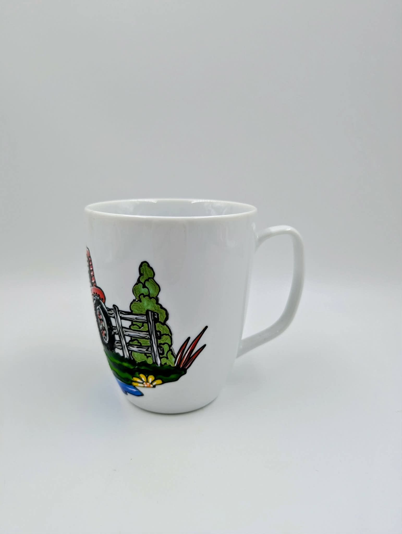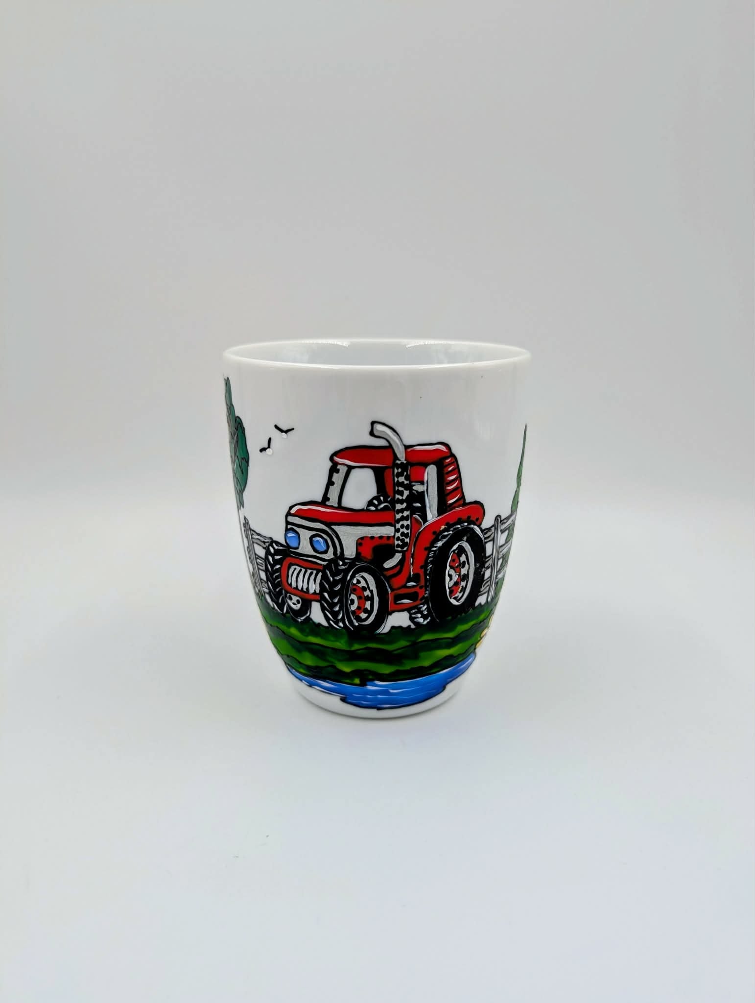 Tasse en porcelaine blanche peinte à la main avec dessins d'un tracteur rouge